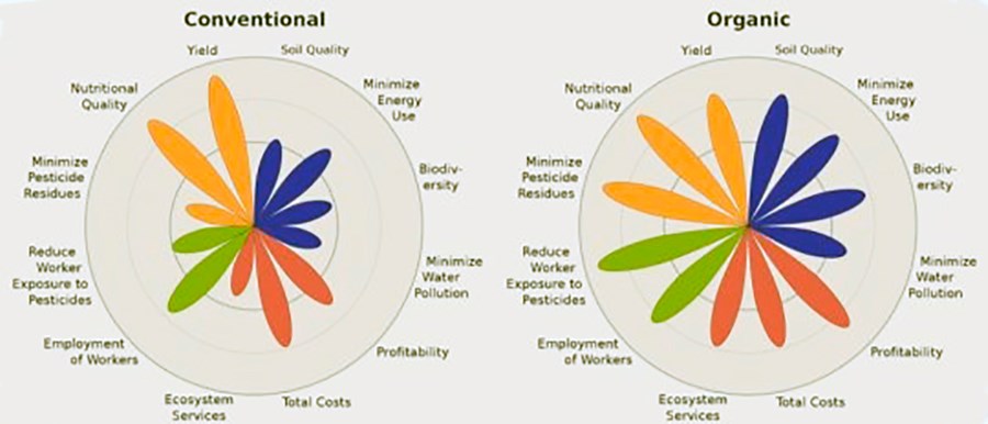 Bandarísk rannsókn, sem tveir landbúnaðarhagfræðingar við Washington State University birtu í febrúar 2016, sýndi að lífrænar aðferðir skila efnahagslegum og  umhverfislegum ávinningi og framleiðniaukningu. Í þurrkatíð getur lífræn uppskera reynst meiri en hefðbundin, en við venjuleg skilyrði er hún oft litlu minni eða jafnvel ekki nema 8%. Bændur í lífrænni ræktun fá 32% hærra verð fyrir vöruna; sala lífrænna afurða í heiminum hefur 5-faldast á 15 árum (1999-2013) og spáð er að hún tvöfaldist fram til 2018. Lífrænn jarðvegur bindur meira kolefni. Lífrænar aðferðir viðhalda líffræðilegum fjölbreytileika, nota minni orku og koma í veg fyrir efnamengun.