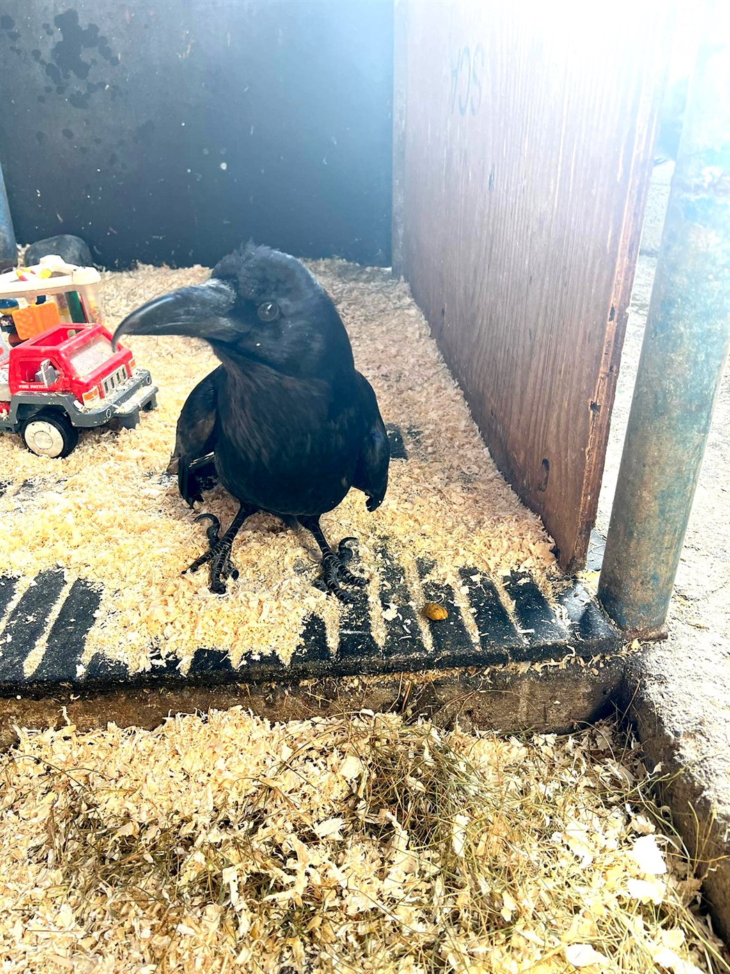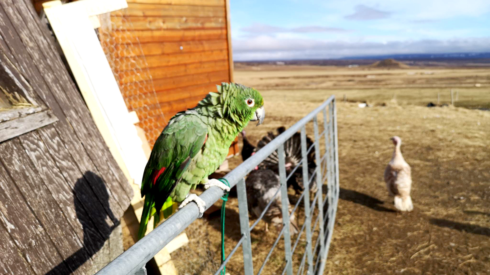Krummi er þó ekki endilega miðpunktur dýraathvarfsins á Hólum því þar má finna hænur, hunda, geitur, hesta, kanínur, kalkúna og naggrísi svo eitthvað sé nefnt, auk stæðilegs páfagaukssemvapparumtúniner sólskins gætir.