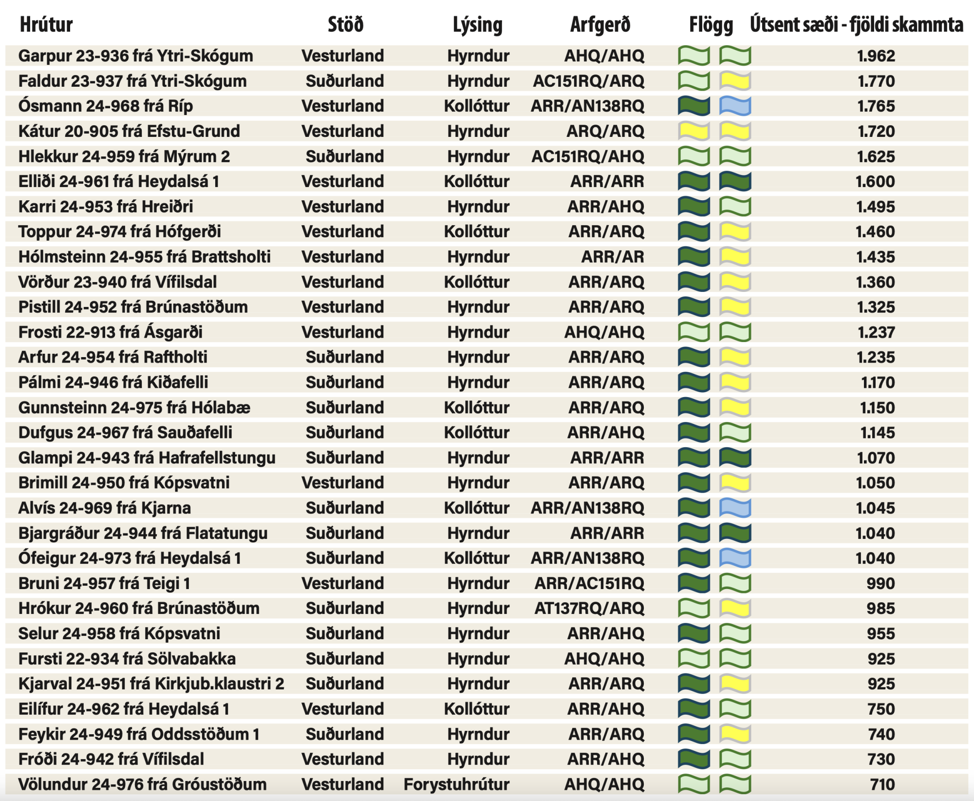 Á meðfylgjandi lista má sjá hversu mikið sæði var sent út frá sæðingastöðvunum báðum úr 30 efstu hrútunum. „Þessi listi gefur ágæta mynd af vinsældum hrútanna en er þó ekki fullkomlega rétt því sumir hrútar önnuðu ekki alveg eftirspurn og því meira sent út í staðinn úr hrútum sem voru duglegri að gefa sæði. Hver raunveruleg notkun er á hrútunum skýrist svo von bráðar þegar bændur hafa klárað að skrá sæðingarnar í Fjárvís.