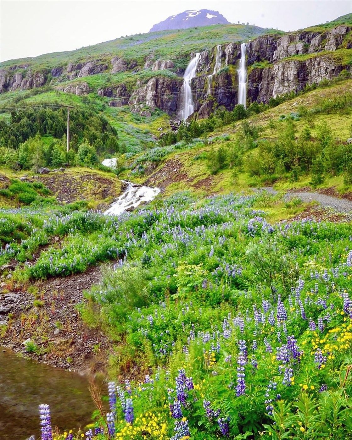 Á ferðum um landið verður manni stundum litið til fjalla. Víða má sjá varnargarða til að verja byggð fyrir snjóflóðum, en á og allt um kring um garðana eru fallegar breiður af lúpínu.