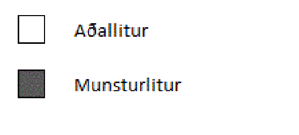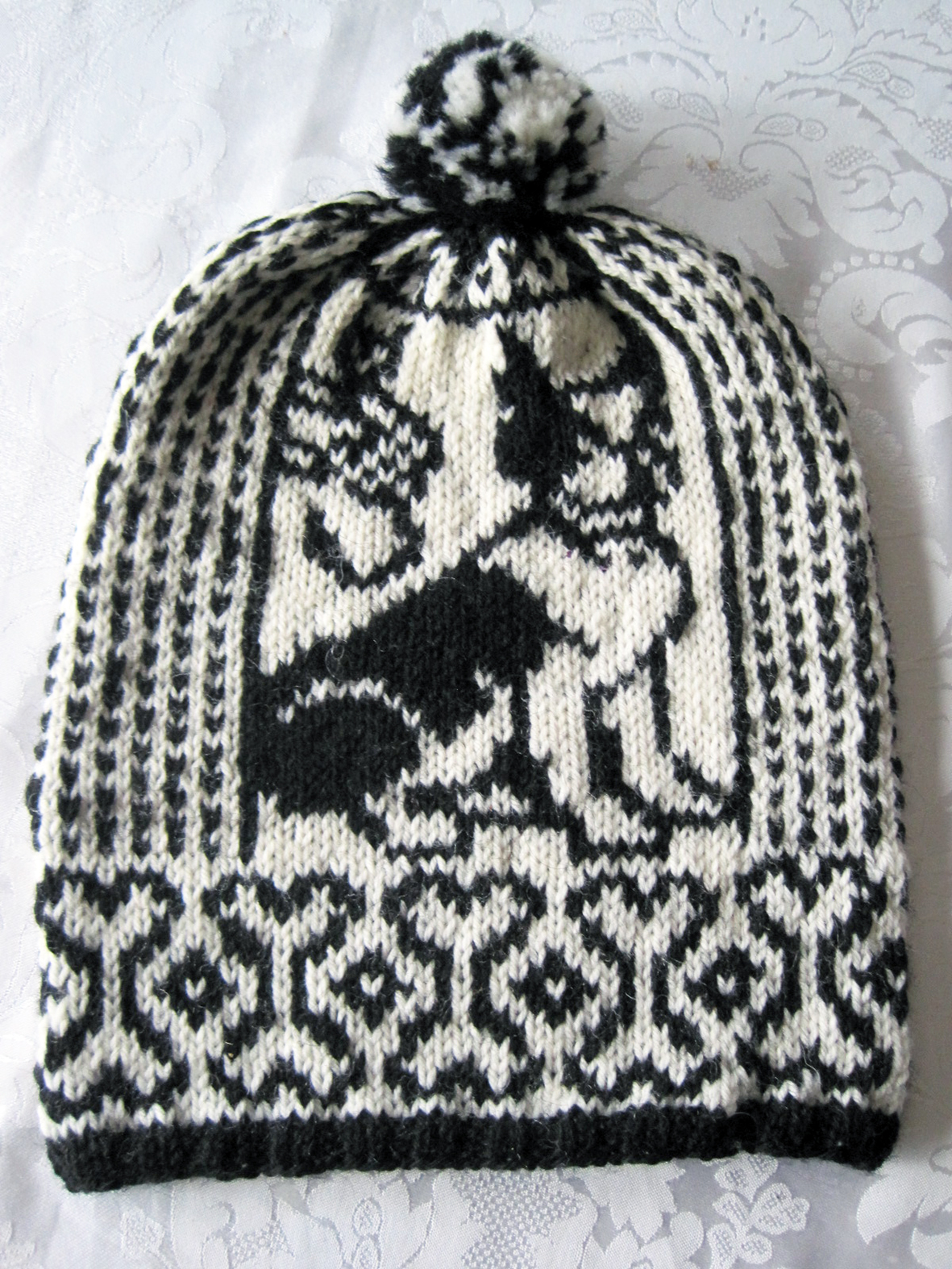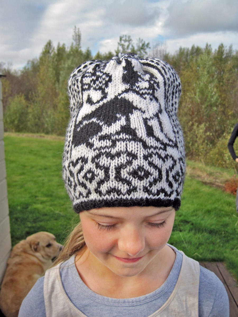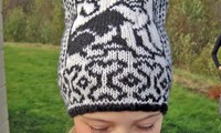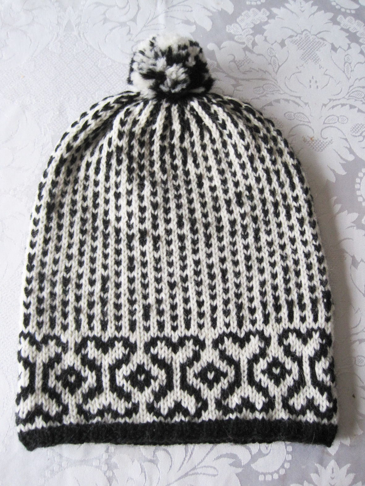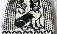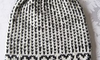 Aðferð: Húfan er prjónuð í hring, í síðustu 3 umferðunum, sem eru svartar, eru teknar saman 2 og 2 lykkjur í seinni 2 umferðunum og síðan bandið dregið í gegnum síðustu lykkjurnar og gengið vel frá því.