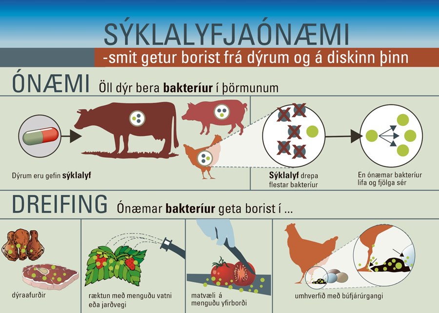 Dýrum eru gefin sýklalyf sem drepa flestar bakteríur. Ónæmar bakteríur lifa hins vegar af og geta gert mikinn óskunda. Þær geta borist beint í dýraafurðir eins og t.d. kjöt. Ef ónæmar bakteríur berast í grunnvatn eða jarðveg er hætta á að gróður verði fyrir mengun. Matvæli geta líka smitast á menguðu yfirborði, eins og skurðarbrettum. Bakteríur geta auðveldlega borist með búfjárúrgangi.
