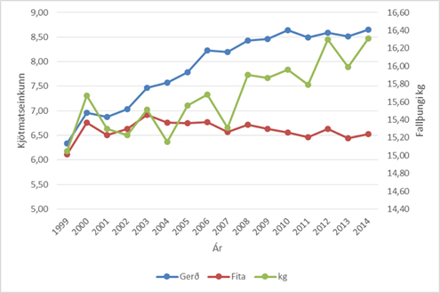 Framfarir í skrokkgæðum frá því ómsjármælingar og EUROP-kjötmatið komu til sögunar eru ótvíræðir. Þannig hefur fitueinkunn samkvæmt kjötmati heldur lækkað á undanförnum árum á meðan meðalfallþungi hefur aukist og gerðin batnað líkt og meðfylgjandi mynd númer 1 sýnir.