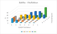 Samræmi á milli fitumælingar á baki og fituflokkunar í kjötmatinu var yfirleitt á bilinu 40–50% á langflestum búanna. Á nokkrum búum var þetta samræmi samt talsvert síðra. Ekki er hægt að sjá neina afgerandi skýringu þessa þó að á flestum þessara búa væri mjög stóran hluta dilkanna að finna í fituflokki 2. Á fyrstu árum ómmælinganna var mikilli áhugi bænda á að geta fundið með mælingu lömbin sem hætt væri við fitufellingu í sláturhúsi en sá áhugi hefur farið minnkandi með minni fitu. Þá virtist sem forsögnin væri nokkuð örugg í hyrnda fénu, færi mæling á baki yfir 4 mm var hættan á fitufellingu umtalsverð. Hjá kollótta fénu var alltaf erfiðara að greina þetta. Lambhrútar undan kollóttu sæðingahrútunum hafa ætíð mælst með talsvert meiri bakfitu þó að fitumat í sláturhúsi hjá þeim sem þangað fara sé talsvert hagstæðara en hjá þeim hyrndu. Hjá einstaka kollóttum lömbum virðist geta verið talsverð fitusöfnun á baki án þess að hún sé á síðunni þar sem mælingin vegna fitumatsins er gerð. Til að skoða þetta aðeins voru skoðaðar í samhengi þessar rúmlega 8000 mælingar sem við höfðum í gögnunum. Myndin sýnir að samræmið er gott eða rúmlega 45%. Ljóst er að örfá tilvik koma þar sem annað hvort fitumatið eða fitumælingin hafa farið úrskeiðis en þau tilvik eru mjög fá. Hins vegar er greinilega nokkuð um lömb sem komin eru á áhættu með fitufellingu með bakmælingar á milli 3–4 mm. Hér verður að vísu að muna að nokkuð er hér af lömbum þar sem verulegar tími leið milli mælingar og slátrunar og hafa þau því getað bætt á sig fitu. Fitufelling hjá lömb­um sem mælast undir 3 mm í bakfitu er hins vegar fáséð.