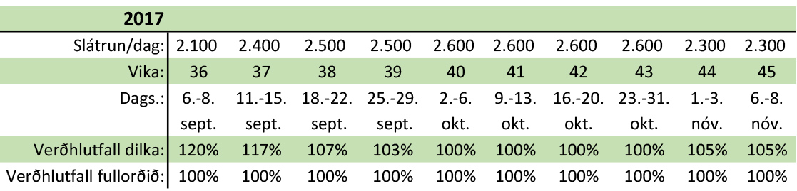 Í tilkynningu frá fyrirtækinu segir að sú breyting verði gerð að samfelld slátrun hefst tveimur dögum fyrr en áður og sláturtími í nóvember verði styttur. Áætlað er að slátrun hefjist 6. september og að engir sláturdagar verði þar á undan. Slátrun í október er einnig aukin. Breytingar verða á verðhlutföllum sem byggja á reynslu þessa hausts og þau gilda aðeins um innlegg sem eru innan gæðastýringar.