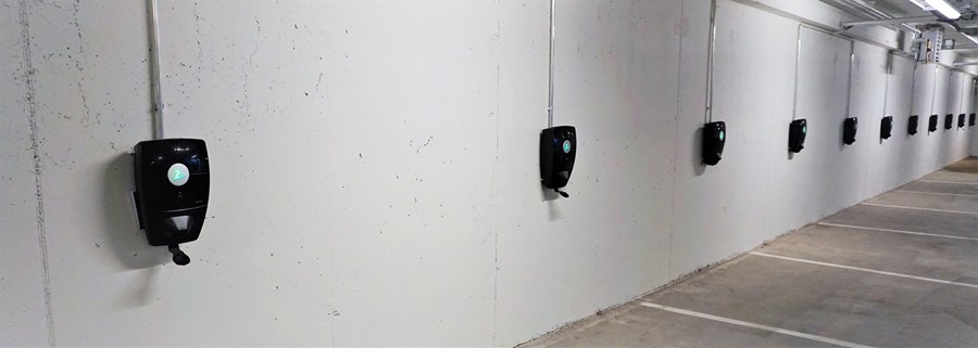 Flestar hleðslustöðvar byrja hleðslu hægt og keyra sig svo upp eins og þessar í nýbyggingu í Reykjavík.