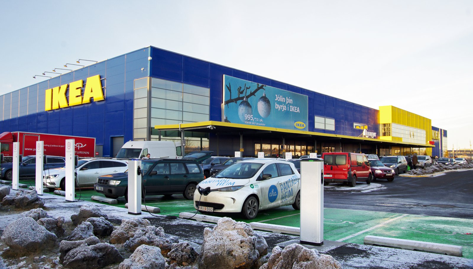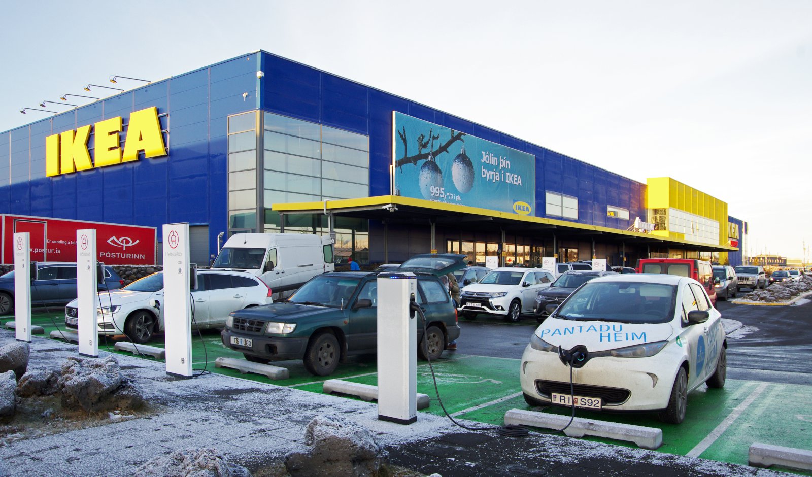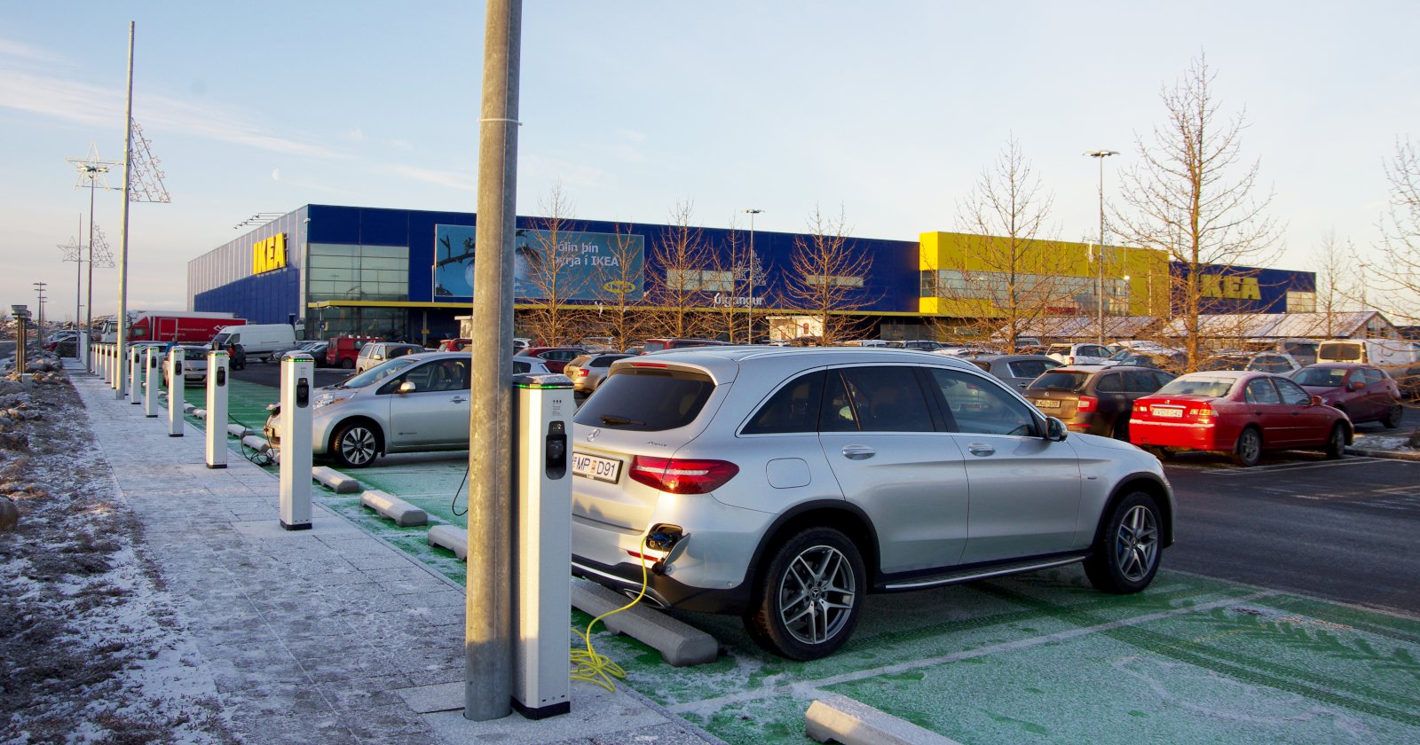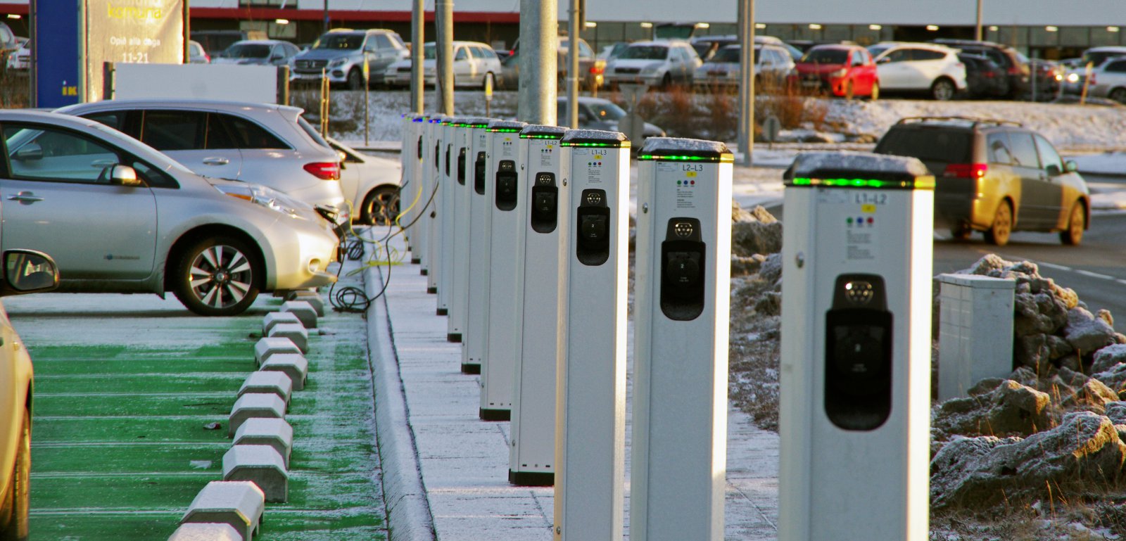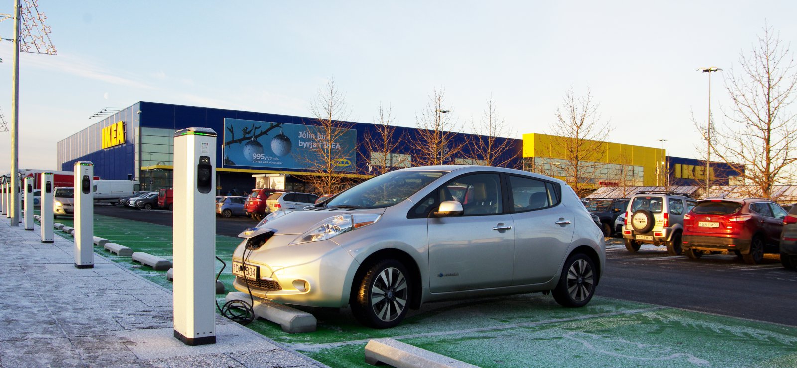 Það er líka annað sem er tengt bílastæðunum og þjónustunni við viðskiptavini IKEA, en það er fjöldi hleðslutækja sem búið er að setja upp fyrir rafbíla. Hvaða hugsun er þar í gangi?