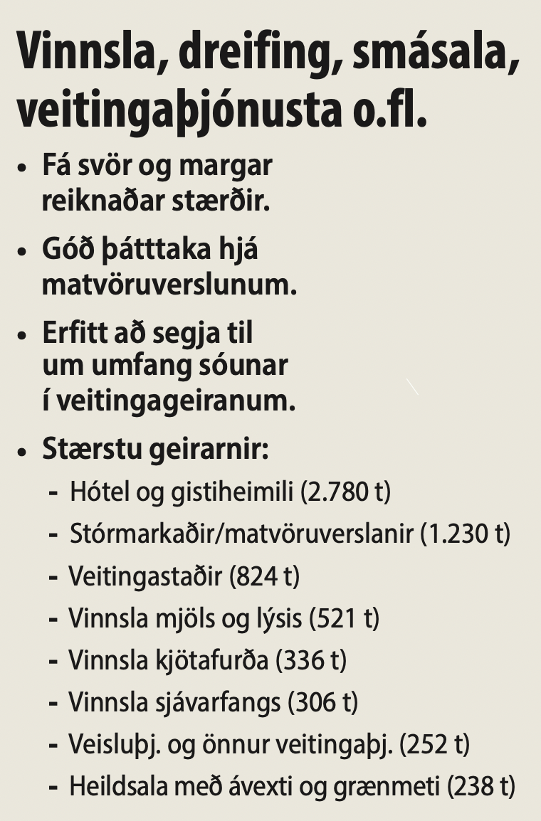 Í tilfelli vinnslu, dreifingar, smásölu, veitingaþjónustu og fleiri þátta var víða fátt um svör og margar reiknaðar stærðir þegar spurst var fyrir um matarsóun. Þó var góð þátttaka hjá matvöruverslunum. Einkum sé erfitt að segja til um umfang sóunar í veitingageiranum. En talið er að hótel og gistiheimili sói árlega 2.780 t, stórmarkaðir og matvöruverslanir 1.230 t, veitingastaðir 824 t, vinnsla mjöls og lýsis 521 t, vinnsla kjötafurða 336 t og sjávarfangs 306 t, veisluþjónusta og önnur veitingaþjónusta 252 t og heildsala með ávexti og grænmeti 238 t.