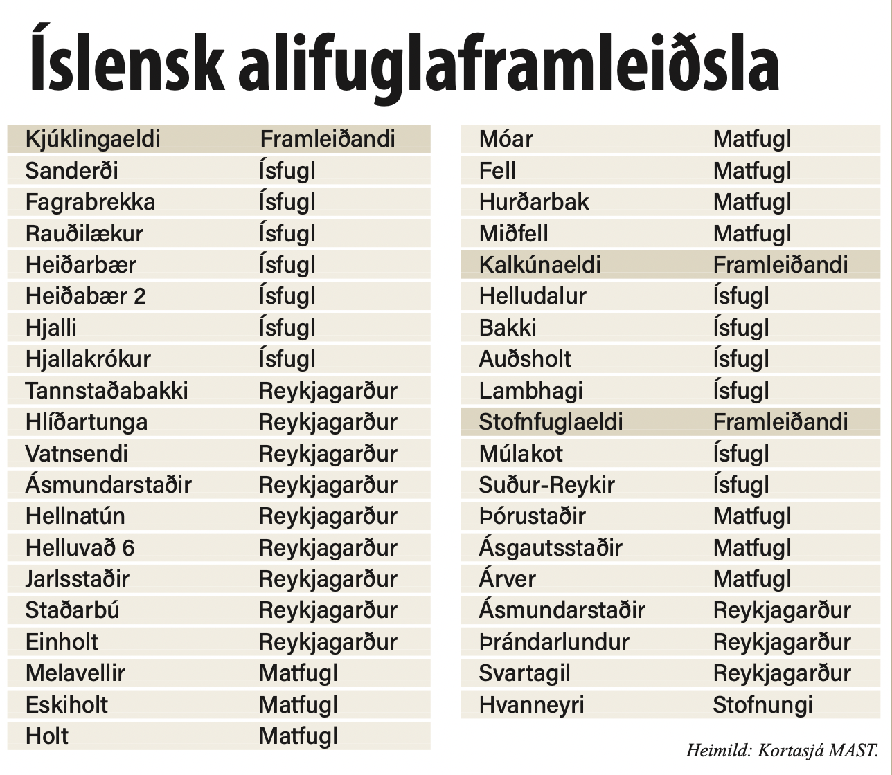 Þrjú fyrirtæki sjá um slátrun og sölu alls alifuglakjöts hérlendis: Ísfugl, Matfugl og Reykjagarður. Ísfugl er þeirra minnst en Matfugl og Reykjagarður af svipaðri stærð. Framleiðslan þeirra er dreifð víða um land, en fer þó að langmestu leyti fram á Suðvestur- og Suðurlandi. Á 23 bæjum á landinu er stundað eldi á kjúklingum og kalkúnaeldi má finna á fjórum stöðum. Á níu stöðum fer fram eldi á stofnfuglum.