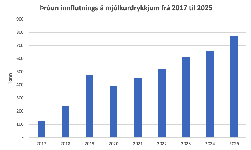 En það er einnig vert að gefa gaum að innflutningi á unnum landbúnaðarvörum sem í flestum tilvikum er tollfrjáls. Þannig er flutt inn talsvert magn af mjólkurdrykkjum sem flokkast sem unnar afurðir.