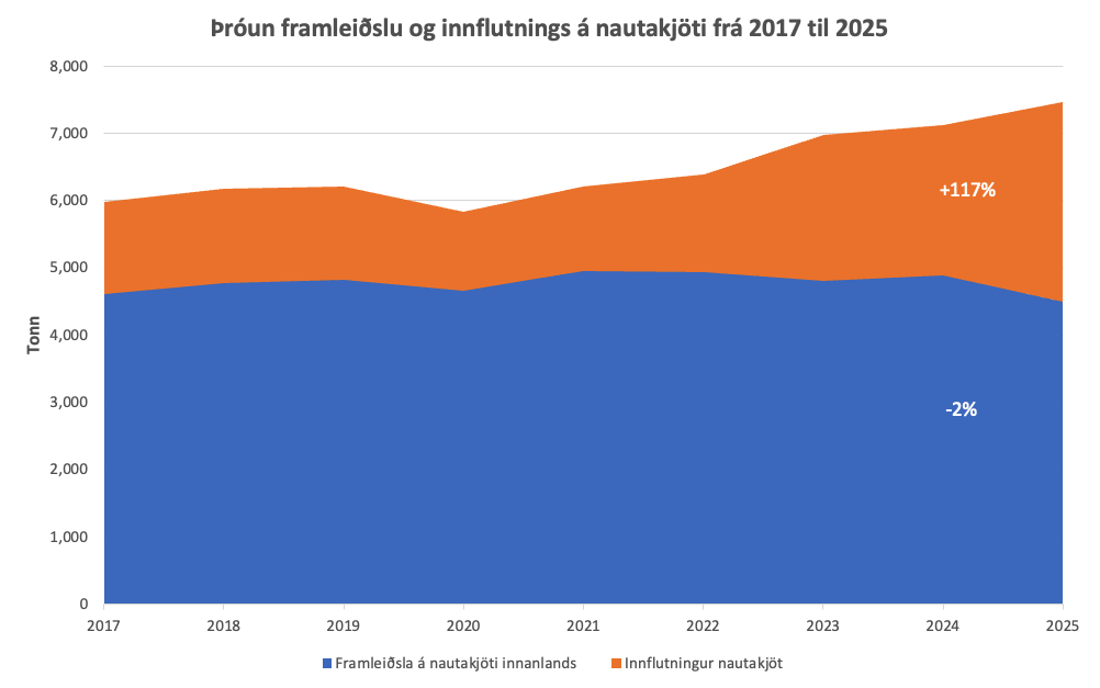 Það er óhætt að segja að bændur á Íslandi hafi nokkuð til síns máls þegar þeir benda á að þeir eigi sífellt meira í vök að verjast gagnvart auknum innflutningi á landbúnaðarvörum. Slaknað hefur verulega á tollvernd til bænda undanfarin ár sem er nauðsynleg til að tryggja sanngjarna samkeppni fyrir innlendan landbúnað. En ýmsir fleiri þættir koma til sem gerir bændum erfitt fyrir að keppa við lönd sem bjóða upp á mun lægra afurðaverð, svo sem hár launakostnaður á Íslandi og takmarkaður fjárfestingastuðningur hins opinbera. Sem dæmi þá hefur framleiðsla á nautakjöti minnkað um 2% frá 2017 til 2025 en innflutningur aukist um 117% á sama tíma.