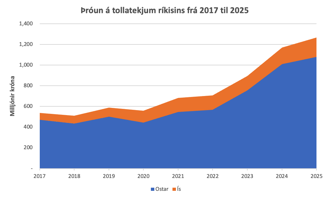 En aukinn innflutningur þýðir jafnframt að tekjur ríkisins af tollum hefur aukist. Ef við skoðum þróun á tollatekjum ríkisins af osti og ís frá árinu 2017 til 2025, þá má sjá að þær hafa nær þrefaldast á osti og rúmlega tvöfaldast á ís. Þannig námu tekjur ríkisins af innflutningstollum á osti ríflega einum milljarði króna árið 2025 og tæplega 200 milljónum króna af ís.