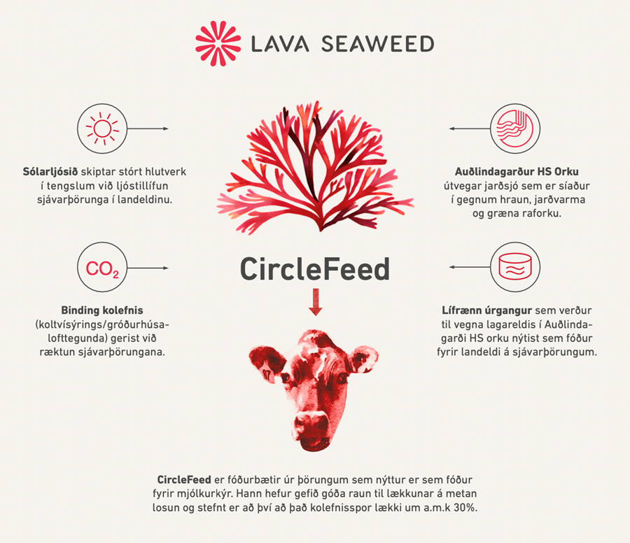 Verkefnið CircleFeed hlaut á dögunum styrk Norræna nýsköpunarráðsins, þar sem markmiðið er að draga úr kolefnisspori nautgriparæktar í landbúnaði að lágmarki um 30%. Til stendur að rækta sjávarþörunga í Auðlindagarði HS Orku, í því augnamiði að nýta þá sem íblöndunarefni í fóður fyrir mjólkurkýr.