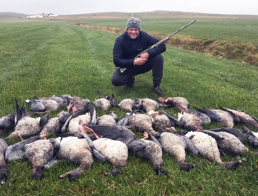 Á leið heim úr Nesinu stoppaði ég við í Víðidalnum en þar beið skotveiðifélagi minn, hann Ási málari, sem hafði boðið mér í gæsaveiði, sagðist vera búinn að finna tún sem væri fullt af heiðagæs og ekki í boði annað en að vaða strax í þá veiði, annars væri hætta á að fuglinn færi suður yfir heiðar. Við stilltum upp gervigæsum um kvöldið og lögðum okkur. Vöknuðum síðan kl. 4.30 um nóttina og þegar ég leit út um gluggann var norðan 12–14 m/s, 0°C hiti og slydduhraglandi – maður lætur ekki veðrið hafa áhrif á veiðigleðina, hugsaði ég, og klæddi mig í tvær lopapeysur undir veiðijakkann.