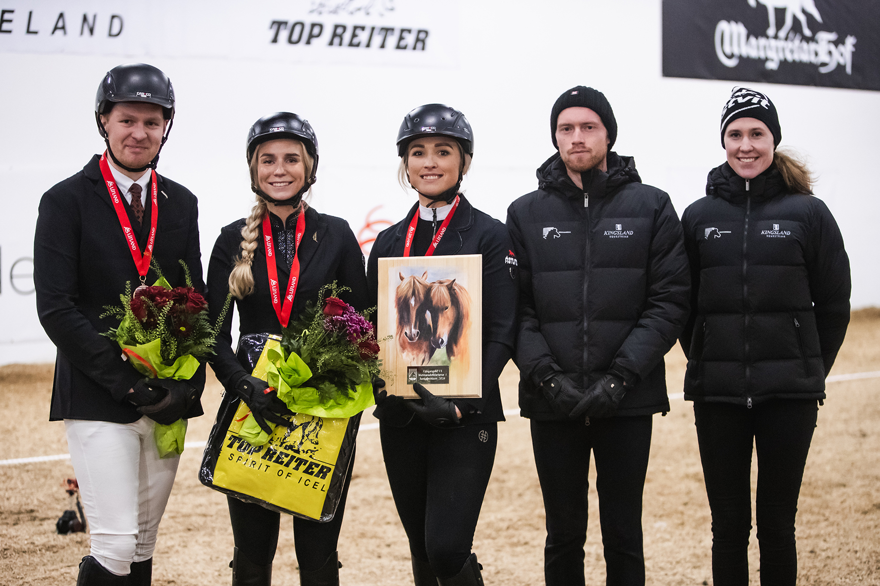 Lið Hestvits/Árbakka unnu liðaplattann í fjórganginum en allir knapar voru í A úrslitum. Á myndinni eru þau Gústaf Ásgeir Hinriksson, Glódís Rún Sigurðardóttir, Jóhanna Margrét Snorradóttir, Pierre Sandsten Hoyos og Fredrica Fagerlund.