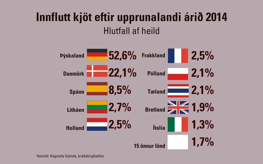 Sú þjóð sem selur Íslendingum mest af kjöti, Þýskaland, notar þrjátíu og fjórum sinnum meira af sýklalyfjum í dýraeldi en Ísland. Rúmur helmingur alls kjöts sem fluttur er til Íslands kom frá Þýskalandi á síðasta ári. Á eftir kemur Danmörk með 22,1% markaðshlutdeild og Spánn er í þriðja sæti með 8,5% af heildarinnflutningi.