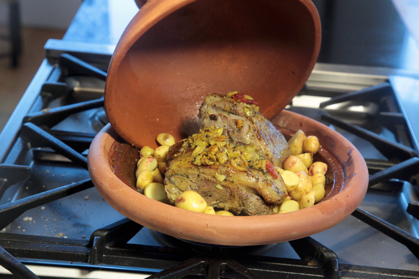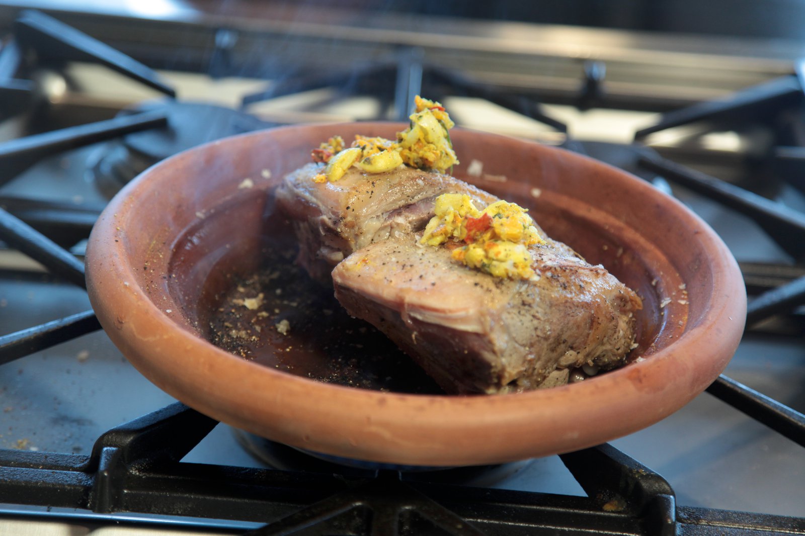Nuddið maukinu vel í kjötið, snöggsteikið kjötið á pönnu í stuttan tíma og setjið svo í leirpott (eða ofnpott). Gufusteikið með ögn af vatni í botninum. Steikið í 60–90 mín. eftir smekk. Að lokum er kjötið sett undir grillið og steikt áfram í 15–20 mín til að kjötið fái gulbrúnan lit.