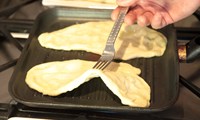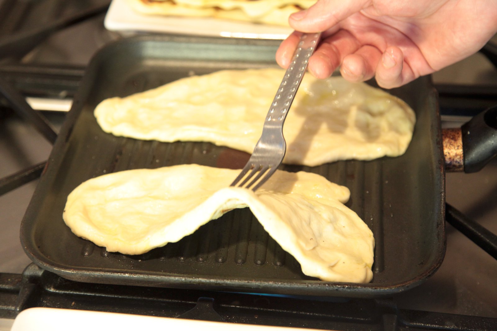 Allt hnoðað saman og látið hefast í 30 mín. Fletjið út í þunnar kökur og steikið á pönnu við háan hita báðum megin. Penslið með hvítlaukssmjöri fyrir framreiðslu.