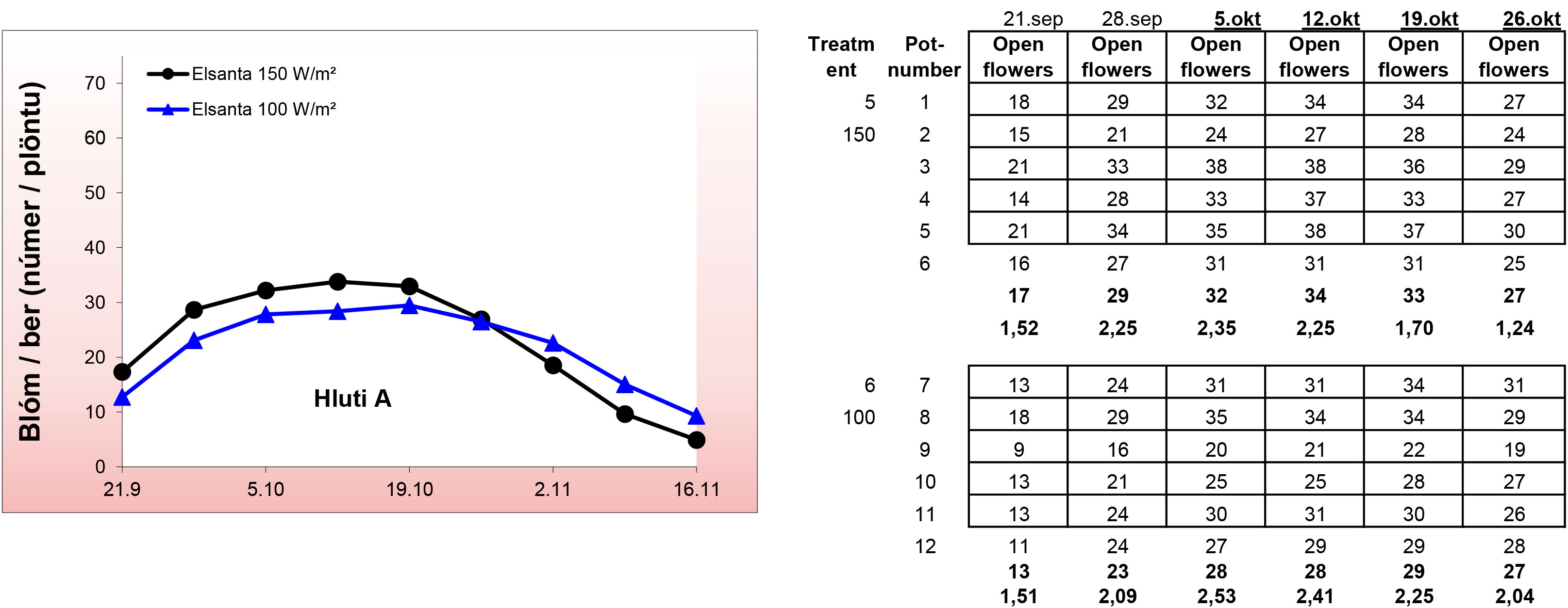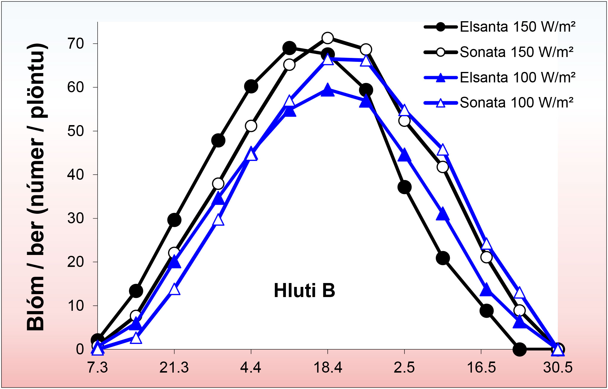 Það tók 1–2 daga frá blómgun til frjóvgunar. Elsanta náði um 35 blóma / berja við hærri ljósstyrk og um 30 við lægri ljósstyrk í hluta A. Fjöldinn var hærri í hluta B um 70 við hærri ljósstyrk með báðum yrkjum en 65 með Sonata og 60 með Elsanta við lægri ljósstyrk (mynd 1). Eftir að hámarki var náð, minnkaði fjöldi jarðarberja þegar byrjað var að uppskera.