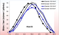Í lok uppskerutímabils fengust 380 g/plöntu markaðshæfrar uppskeru með Elsanta við 150 W/m2 en 320 g/plöntu við 100 W/m2 í hluta A. En í hluta B fengust 740 g/plöntu með Elsanta og 830 g/plöntu með Sonata við 150 W/m2 og 680 g/plöntu með Elsanta og 740 g/plöntu með Sonata við 100 W/m2. Munurinn var oftast ekki tölfræðilega marktækur hvorki milli ljósstyrkja né milli yrkja. Hins vegar var uppskera af Sonata um 10 % hærri samanborið við Elsanta.