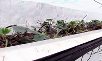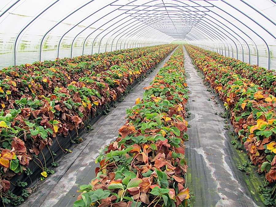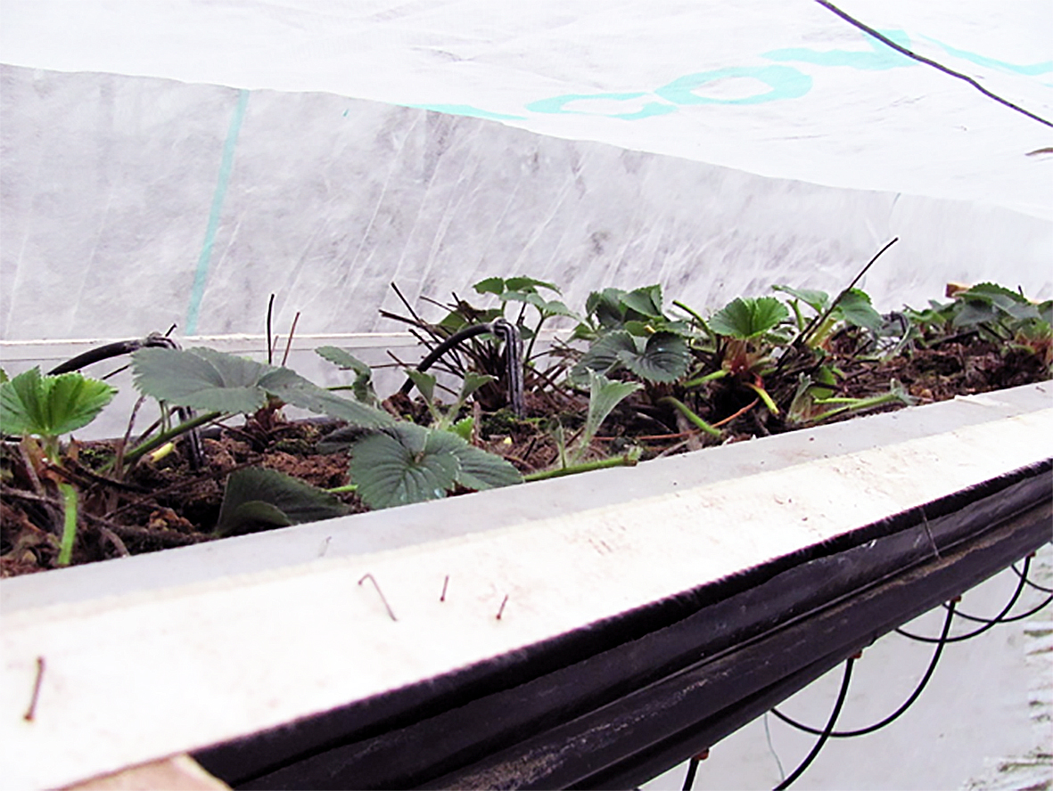 Annar möguleiki er að rækta í gróðurhúsum í pottum á háum beðum. Dúkur er breiddur yfir plönturnar þar til blómgun hefst. Með þessari aðferð er hægt að að fá þroskuð ber meira en einni viku fyrr en án dúks (mynd 2).