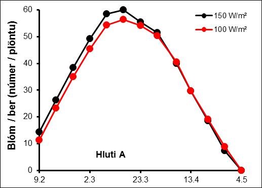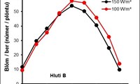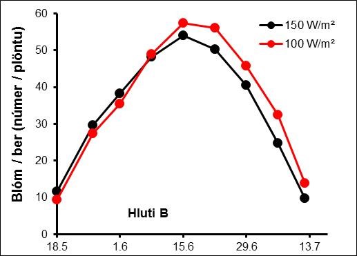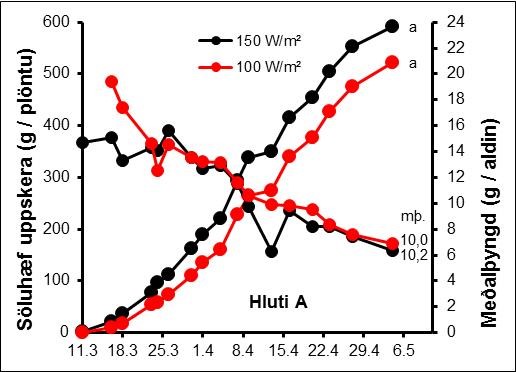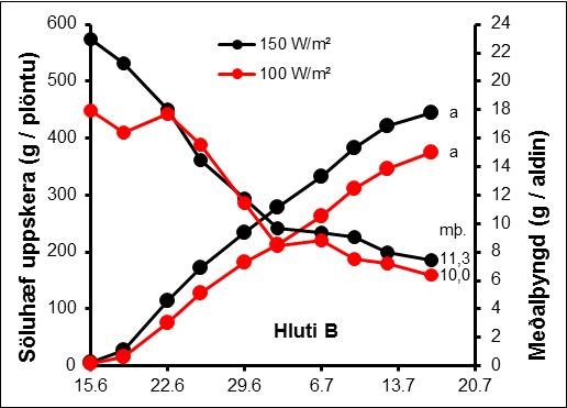 Ástæðan fyrir meiri uppskeru við hærri ljósstyrk var aukinn fjöldi jarðarberja í úrvalsflokki, en meðalþyngd minnkaði eftir því sem leið á uppskerutímabilið frá 15–23 g/ber til um 7 g/ber og var aðeins hærri við 150 W/m2 í hluta B en ekki í hluta A (mynd 2).