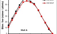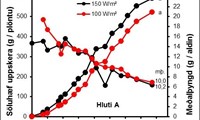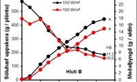 Ávextir voru þroskaðir eftir 42 daga í hluta A og í hluta B eftir 33-35 daga. Í upphafi uppskerutímabils gaf meðferð með hærri ljósstyrk nokkrum dögum fyrr þroskuð ber en við 100 W/m2 (mynd 2). Í lok uppskerutímabils fengust 600 g/plöntu markaðshæfrar uppskeru við 150 W/m2 en 500 g/plöntu við 100 W/m2 í hluta A, en munurinn var ekki tölfræðilega marktækur. Í hluta B fengust 450 g/plöntu við 150 W/m2 en rúmlega 350 g/plöntu við 100 W/m2 sem var heldur ekki tölfræðilega marktækur munur.