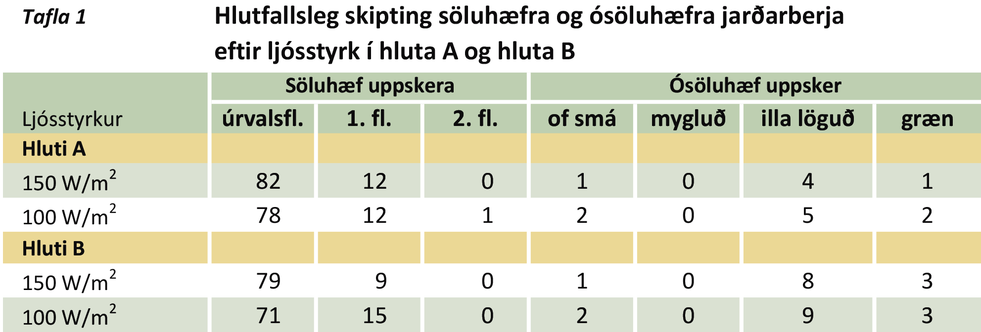 Það virðist sem ómarkaðshæf uppskera hafi minnkað við hærri ljósstyrk. Hlutfall uppskerunnar sem hægt var að selja var 90–94 % í hluta A og 86–88% í hluta B. Hærra hlutfall ómarkaðshæfrar uppskeru í hluta B var vegna hærri hluta af jarðarberjum sem voru illa löguð vegna ófrjóvgunar (tafla 1).
