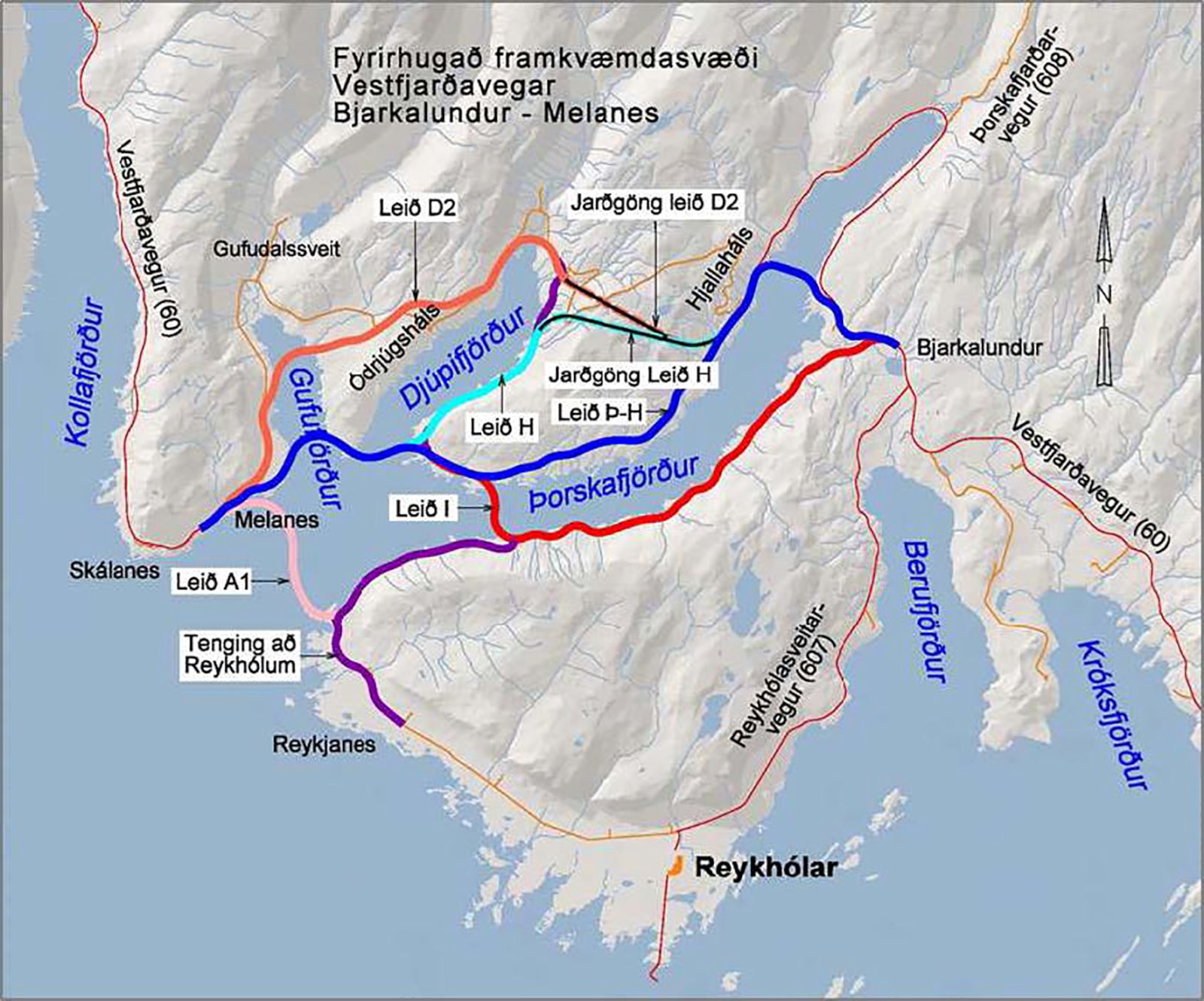 Tilllögur sem lagðar hafa verið fram um margar mismunandi leiðir í vegagerð frá Þorskafirði í Kollafjörð. Vegagerðin vill fara Þ-H leið (Dökkbláa línan) um Teigskóg með þverun í innanverðum Þorskafirði yfir mynni Djúpafjarðar og Gufufjarðar í Melanes. Þessi leið yrði öll á láglendi ólíkt þeirri leið sem Skipulagsstofnun leggur til þar sem Ódrjúgsháls yrði áfram inni í myndinni. Auk þess er hún ríflega 20 kílómetrum lengri.