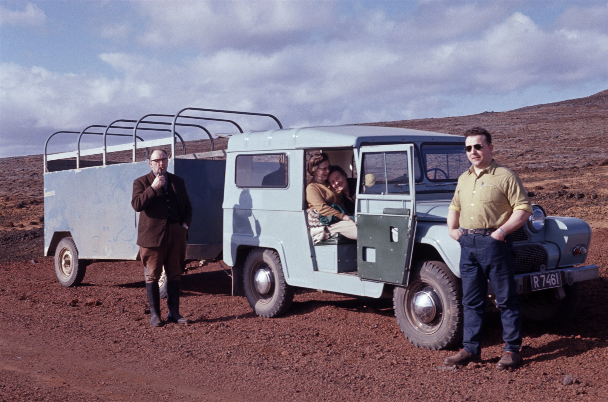 Guðmundur Hjörleifsson tók þessa mynd af óþekktu fólki á Austin Gipsy-jeppa með gripakerru í eftirdragi árið 1965.