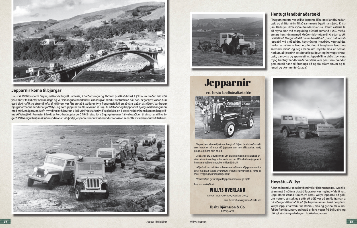 Hér má sjá opnu úr kaflanum sem snýr að Willys-jeppunum. Þeir voru meðal þeirra jeppa sem snertu bændur hvað mest, enda öflug landbúnaðartæki og komu á sjónarsviðið um það leyti sem vélvæðing reið yfir íslenskar sveitir.