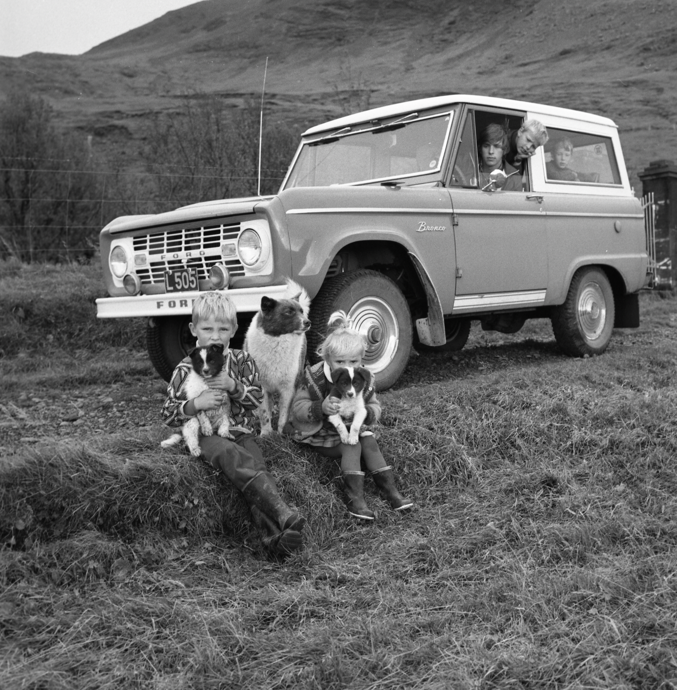 Þessi ljósmynd eftir Ottó Eyfjörð sýnir krakka með hvolpa sitja framan við Bronco-jeppa. Ártal óþekkt, en sennilega tekin á sjöunda áratugnum.