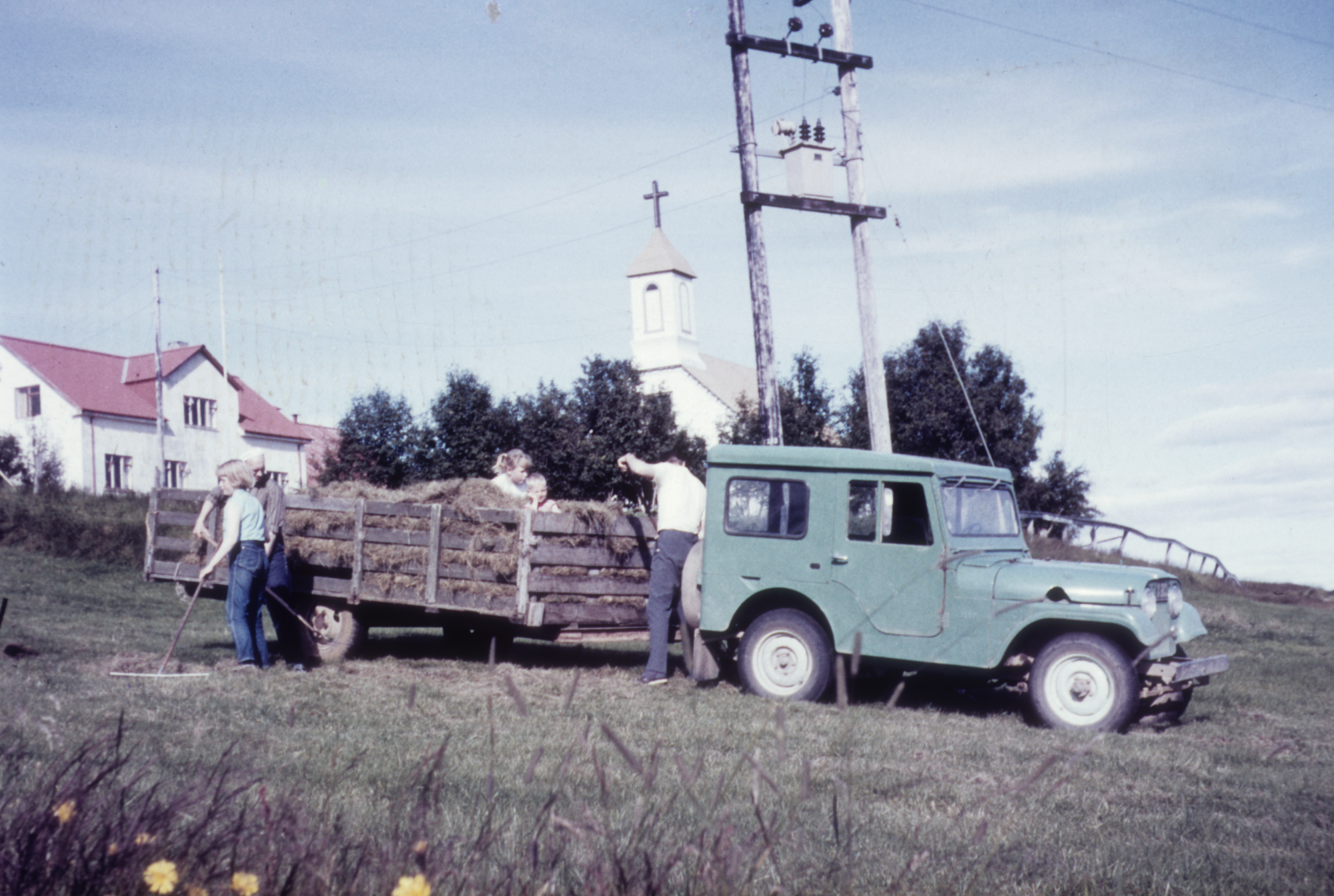 Willys-jeppi í heyskap á Torfastöðum á áttunda áratugnum. Ljósmyndina tók Guðmundur Óli Ólafsson.