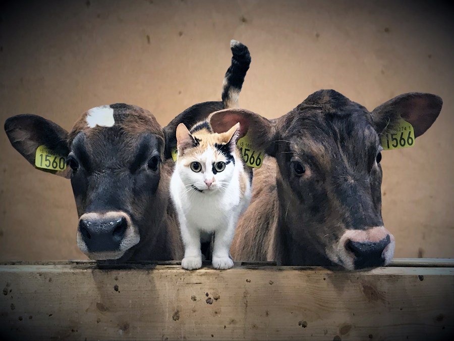 Kálfarnir Rósa og Drós ásamt kettinum Steypu í fyrsta sæti