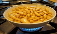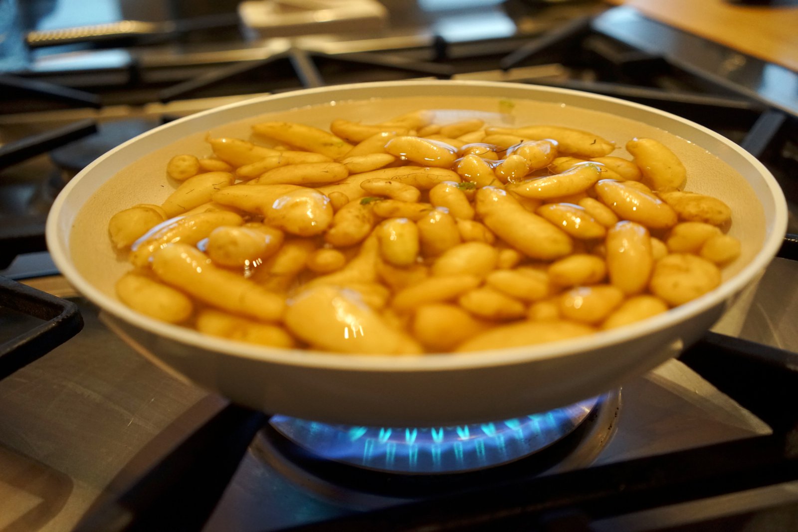 Komið upp suðu. Setjið lok á pottinn (fatið) og látið malla um 10 mínútur. Fjarlægið lokið. Haldið áfram að elda þar til kartöflurnar er mjúkar í miðju og soðið farið að þykkna. Skreytið með steinselju eða öðru grænu kryddi, spínati eða grænkáli og smakkið til með salti og pipar. Framreiðið í eldföstu fati.