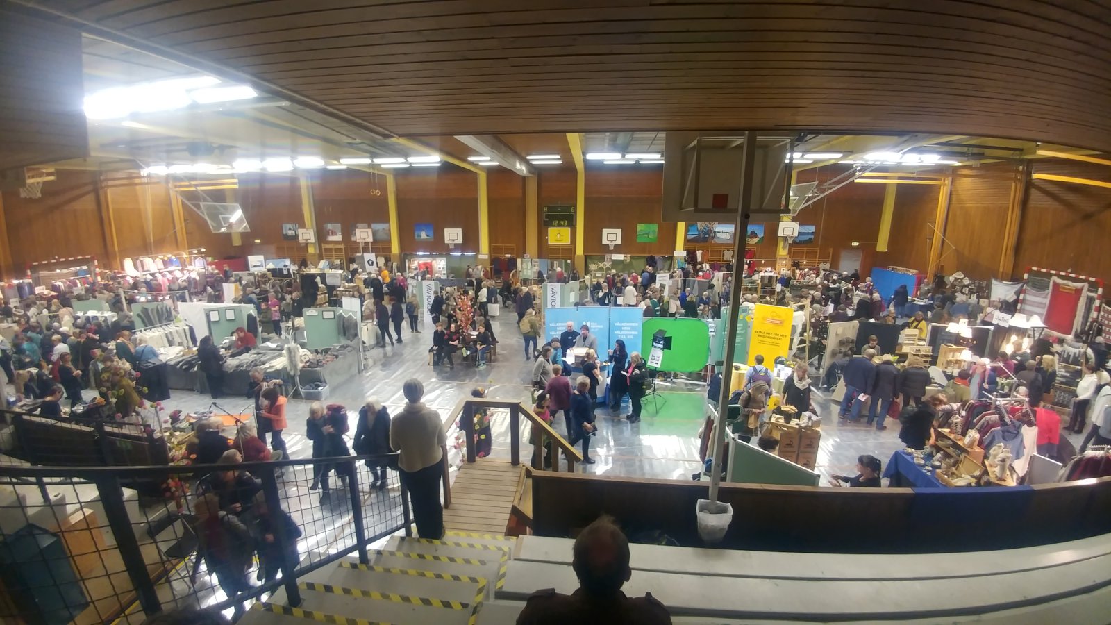 Yfirlitsmynd yfir íþróttasalinn. Bás Fræðaseturs um forystufé er hægra megin, efst í horninu.