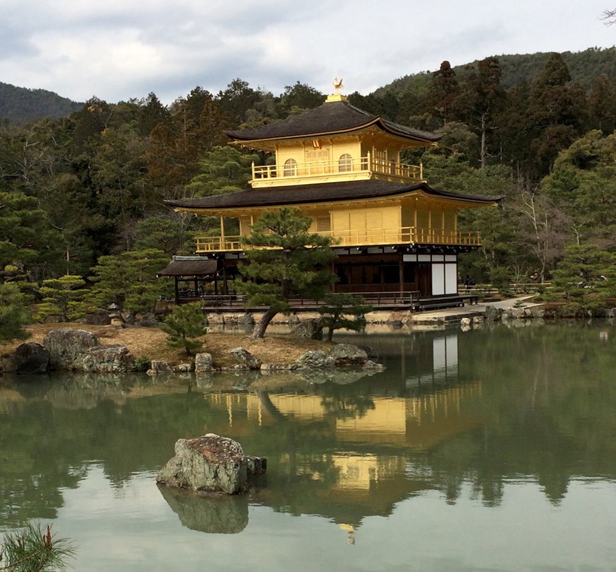 Þegar gengið er í garðinn í átt að hofinu er farið um trjágöng sem skyggja á útsýnið. Skyndilega opnast göngin og hofið blasir við handan lítils stöðuvatns og speglar í því fullkomna harmóníu milli himins og jarðar í gullinni dýrð.