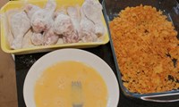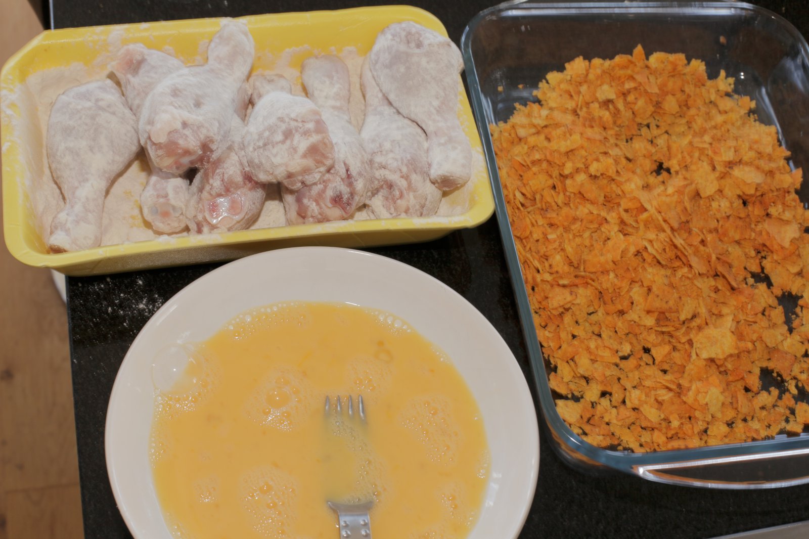 Hitið ofninn í 200 °C. Myljið kornflögurnar smátt og veltið upp úr eggi sem búið er að blanda saman við krydd. Þerrið kjúklingaleggina og kryddið þá með salti og pipar.