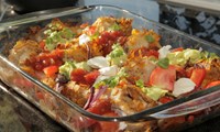Raðið leggjunum í eldfast fat og dreifið afganginum af flögunum yfir. Setjið í ofninn og bakið í 35 mínútur eða þar til leggirnir eru gegnsteiktir.