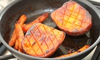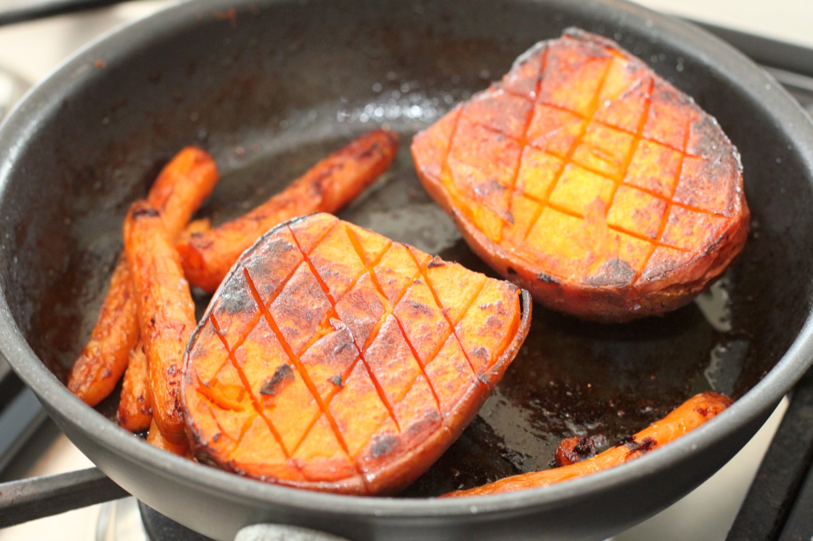 Sætu kartöflurnar og gulræturnar ristaðar á pönnu og loks bakaðar í ofni þar til þær eru orðnar mjúkar. Kryddið með salti og pipar.
