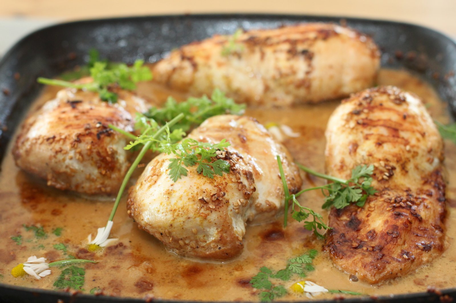 Setjið bringurnar aftur á pönnu eftir eldun, hellið kókosmjólkinni og sojasósunni yfir þær ásamt ristuðum sesamfræjum.