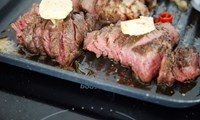 Skrælum og skerum sætu kartöflurnar í þunnar sneiðar og steikjum þær á pönnu eða á útigrilli á báðum hliðum þar til þær eru fulleldaðar. Penslum með matarolíu á meðan grillað er. Kryddum með salti og pipar. Grillum nautakjötið eftir smekk (fyrir millisteikt kjöt; tvær mínútur á hvorri hlið við snarpan hita og láta kjötið hvíla í um 10 mínútur áður en það er borið fram). Penslum kjötið með grillsósunni í lokin.
