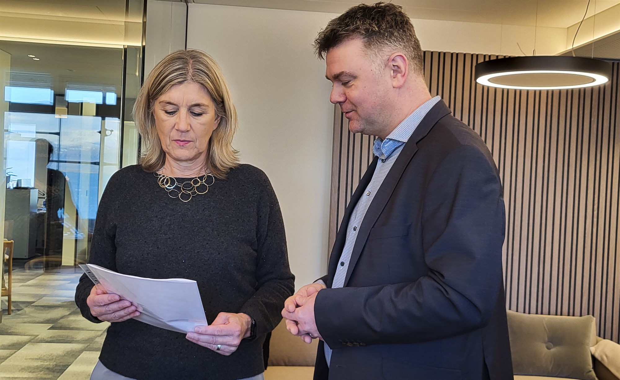 Hanna Katrín Friðriksson tekur við undirskriftum frá Baldri Helga Benjamínssyni.