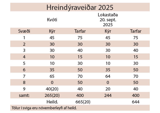 Hreindýraveiðitímabilinu er lokið. Veiða mátti 665 hreindýr í ár, 400 tveggja vetra og eldri tarfa og 265 kýr.