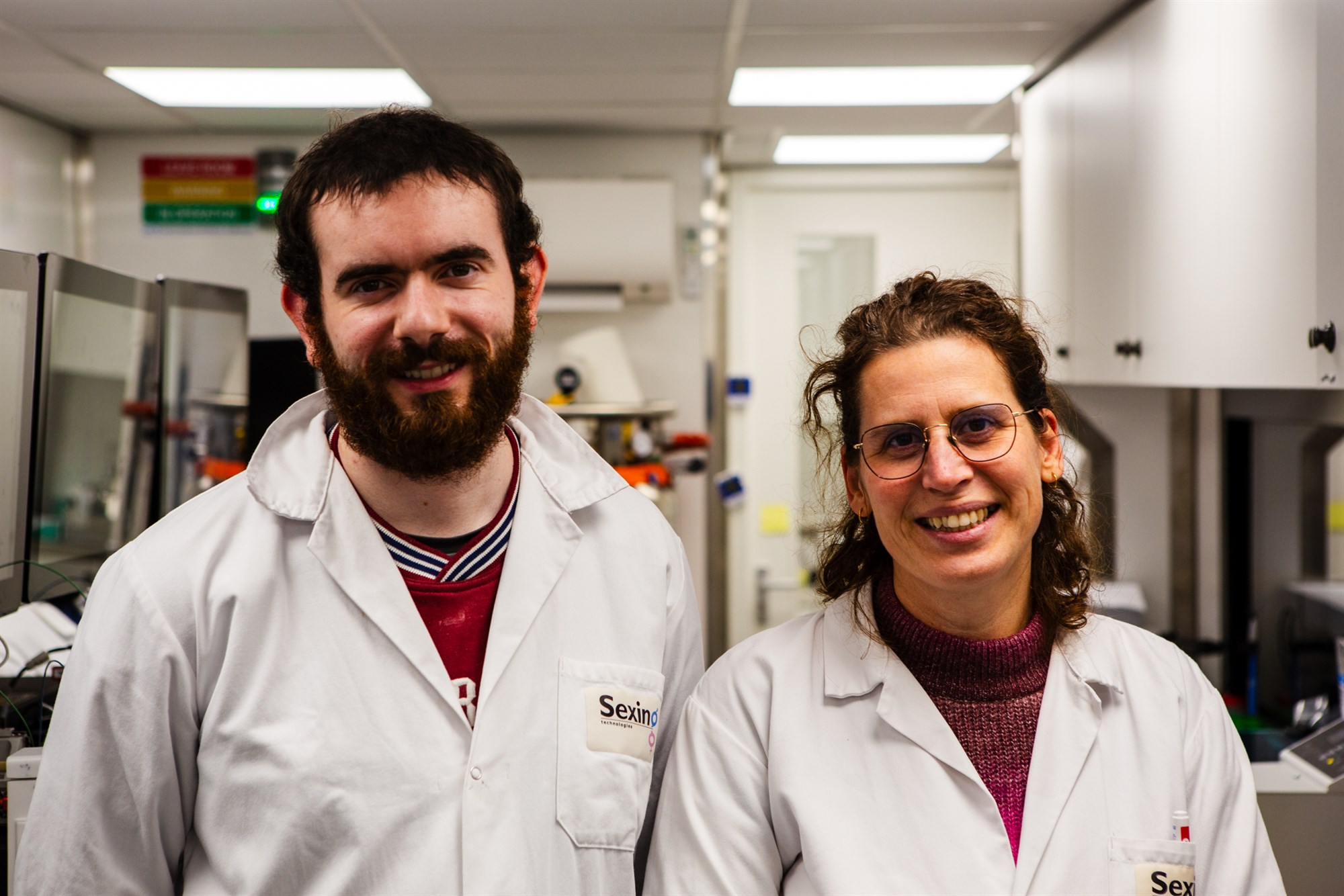 Ronan Raftery og Mariska Bakker frá Inguran LCC. Þau eru meðal starfsmanna sem vinna allan sólarhringinn við kyngreiningu sæðis.