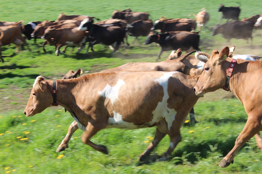 Kýrnar á bænum Garði í Eyjafjarðarsveit gripu tækifærið fegins hendi þegar þeim var hleypt út í fyrsta sinn á þessu sumri föstudaginn 1. júní.