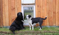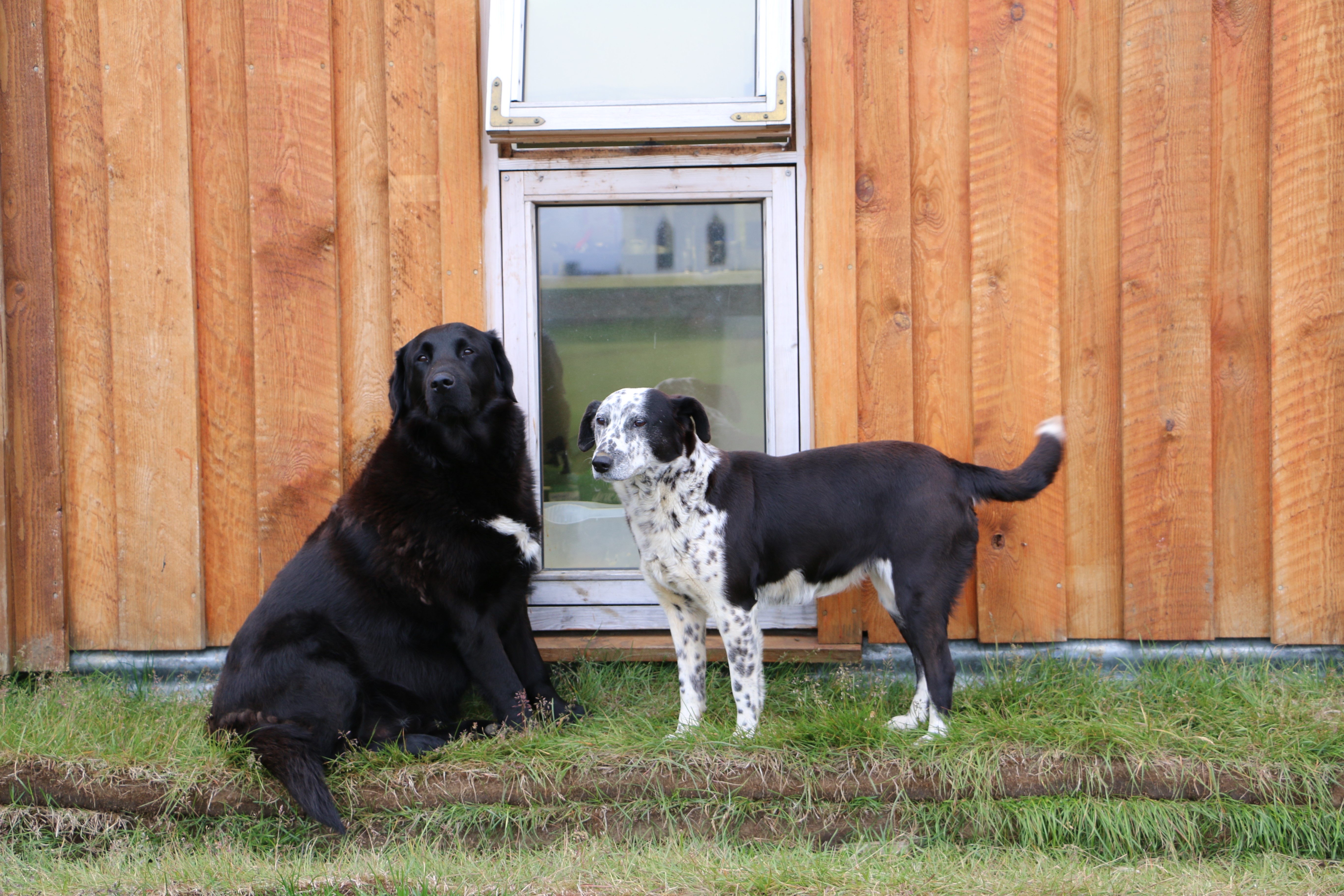 Hundarnir á hlaðinu taka blíðlega á móti gestum.