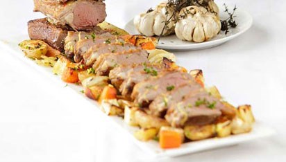 Lambahryggur með sítrónubættri steinseljusósu, bökuðu grænmeti og kartöflum