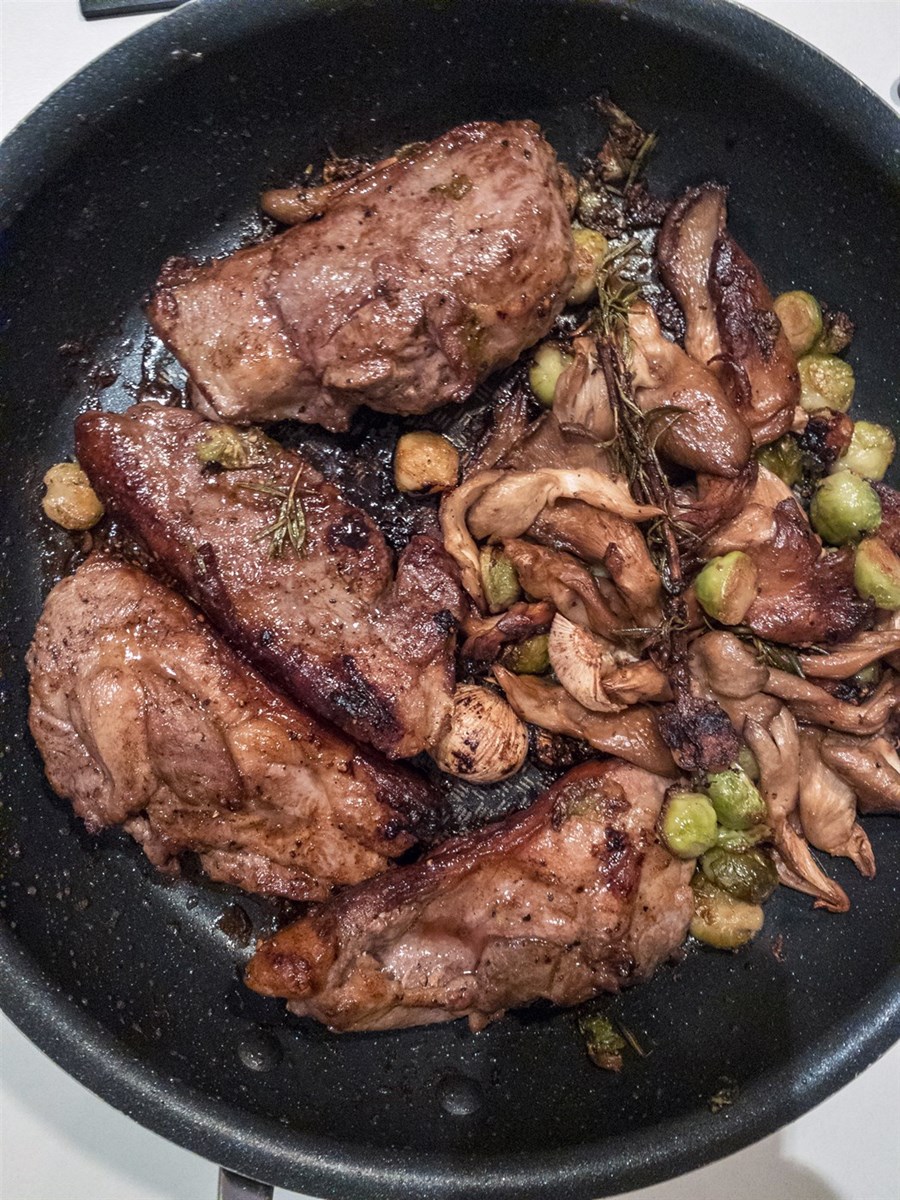 Steikið á pönnu með rósakáli og sveppum í um fjórar mínútur á hvorri hlið (fyrir miðlungs eldun). Færið pönnuna í ofn í fimm mínútur og berið fram.