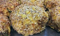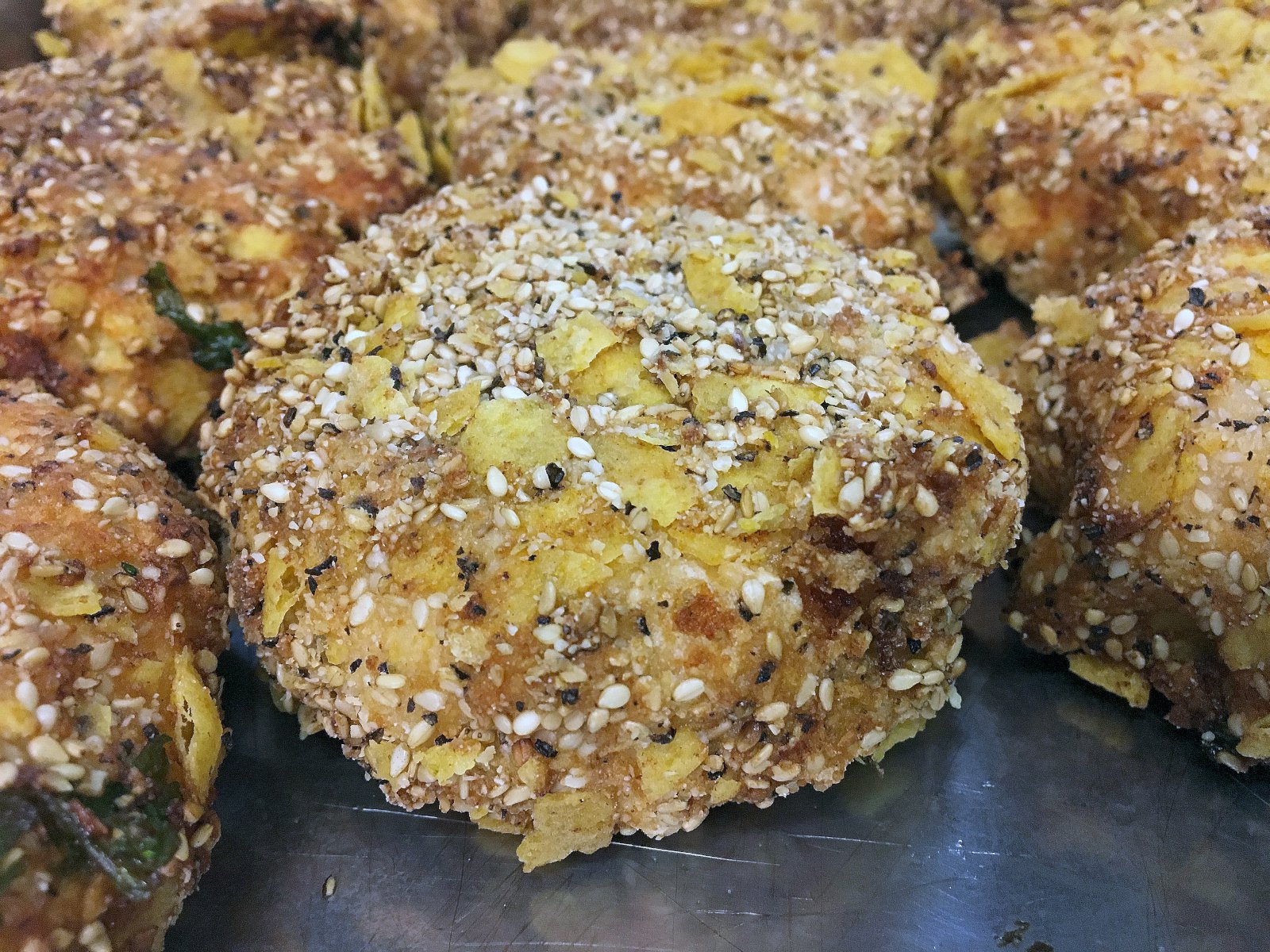 Setjð svo hveiti á disk og eggjahvítu á annan disk. Svo er borgarinn settur fyrst í hveitið, svo eggjahvítuna og svo í tortillamylsnuna. Hjúpið allan borgararann og endurtakið með alla hina. Hitið stóra pönnu yfir miðlungs hita og setjir tvær matskeiðar af ólífuolíu á pönnuna. Steikið borgarana á báðum hliðum þangað til þeir eru gullnir á lit, í um tvær til þrjá mínútur á hvorri hlið (ég geri þetta í tveimur skömmtum). Látið hvíla í heitum ofni í að lágmarki á aðra mínútu eða í tvær til að tryggja að þeir eru heitir inn að miðju.